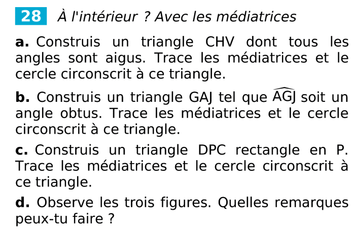 Construction illustrant les droites remarquables d'un triangle. Maintenir le clic gauche et appuyer respectivement "o" ou "h" ou "m" ou "i", pour faire apparaître les médiatrices, hauteurs, médianes ou bissectrices du triangle