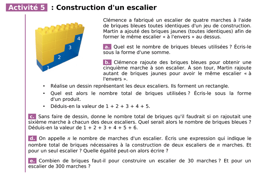 Bouger le curseur "Jaune" pour faire apparaître et disparaître les briques jaunes, bouger la poignée rouges pour modifier le nombre de marches de l'escalier, maintenir le clic gauche et appuyer sur "n" pour faire apparaître le nombre de marches bleues et de marches jaunes