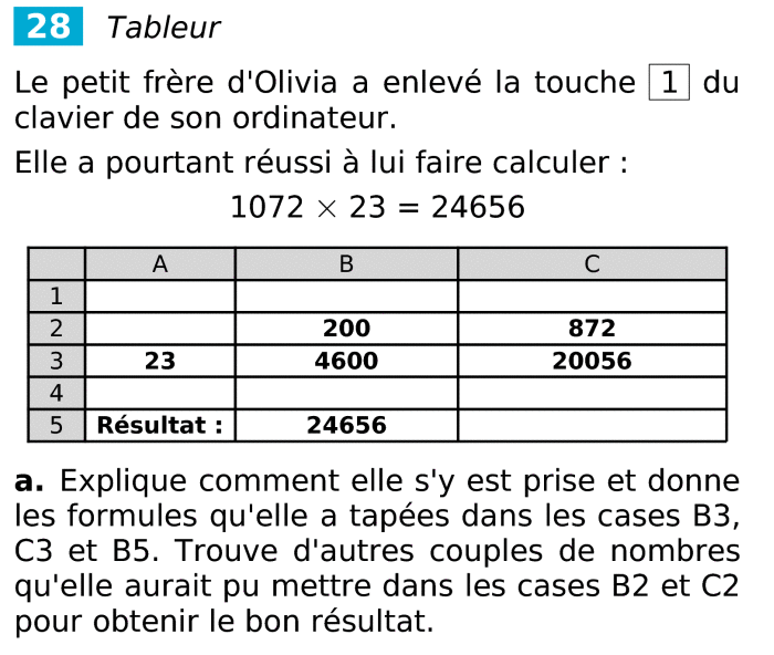 Tableur correspondant aux questions a) et b)
