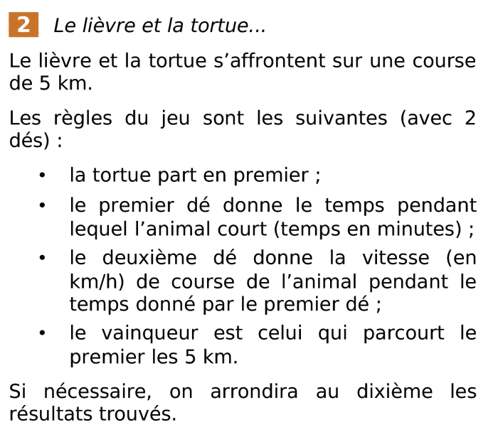 Feuille de calcul illustrant la question f, indiquant la distance parcourue en km en fonction de tous les tirages de 2 dés possibles