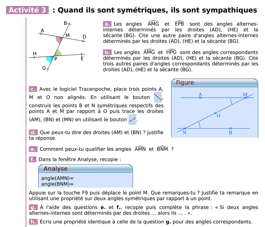 Maintenir le clic gauche et appuyer "a" pour faire apparaître les angles alternes-internes ou sur "b" pour faire apparaître les angles correspondants