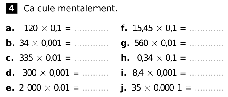 Exercice interactif : Multiplications par 0,1 ; 0,01 ; 0,001 ; etc.